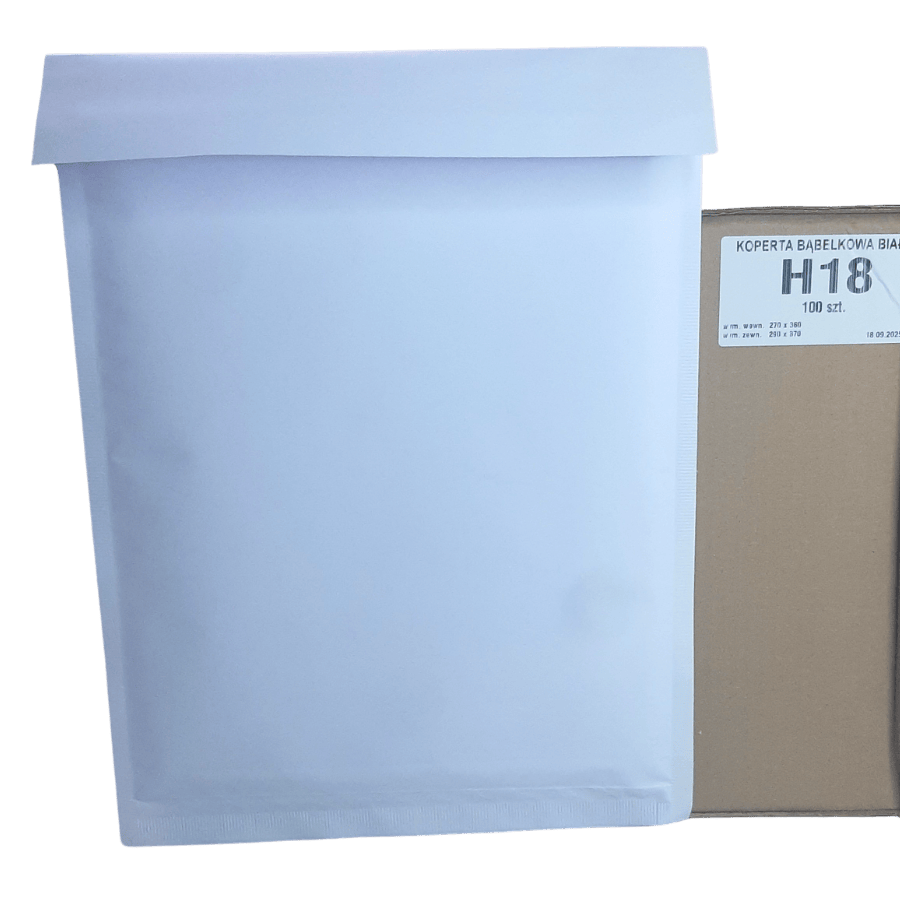 Koperta bąbelkowa H18 (270×360 mm) w eleganckim białym kolorze to praktyczne rozwiązanie dla każdej firmy wysyłkowej. Wewnętrzna folia bąbelkowa chroni produkty przed uszkodzeniami, wstrząsami, co minimalizuje ryzyko reklamacji i zwiększa zadowolenie klientów.
