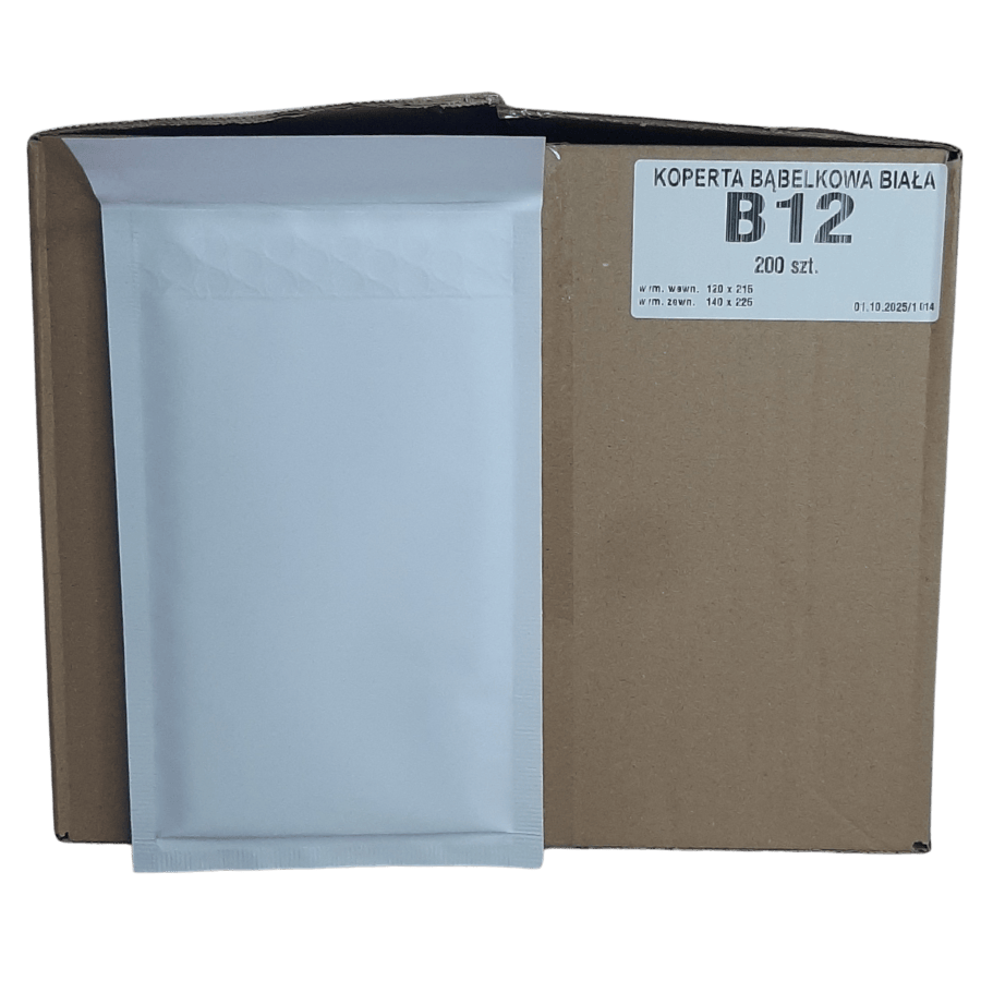 Koperty bąbelkowe B12 w kolorze białym to niezawodne rozwiązanie do bezpiecznego pakowania i wysyłki małych produktów. Wewnętrzna warstwa z folii bąbelkowej skutecznie chroni zawartość przed uszkodzeniami, a zewnętrzna warstwa z mocnego papieru nadaje przesyłce czysty, profesjonalny wygląd. To idealne połączenie estetyki i funkcjonalności w codziennej obsłudze zamówień.